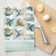 Turquoise hummingbirds flit amongst tea sets against a mint and white striped background. Your name at the bottom.