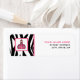 A return address label for teachers featuring an illustration of the Pink Schoolhouse logo at left over a zebra print background with pink trim. Personalise with your name and address at right.