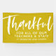 Say thank you to the school teachers and staff with this personalised banner. Perfect for teacher appreciation week, the end of the school year or even the start of a new year, this sign features a golden yellow background with a fun modern script thankful along with your custom text that can include the school year or a thank you to specific people.
