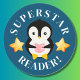 A cute penguin reading 'Superstar Reader' sticker, ideal for rewarding your child or student for their reading performance. Kids will adore this cute hand drawn penguin who is holding a book. These stickers are a fun and super cute way to reward your hard working kids!