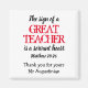 This is a modern MAGNET with an inspirational message based on the Bible Scripture verse from Matthew 20:26, which says THE SIGN OF A GREAT TEACHER IS A SERVANT HEART, with additional text at the bottom that says THANK YOU (plus placeholder name). The text for GREAT TEACHER and the THANK YOU message are both CUSTOMIZABLE, so you can change the role (eg. GREAT MENTOR) and the greeting/name as required. This would make a great TEACHER APPRECIATION gift for your favourite teacher, either at Christmas or at end-of-year to say Thank You. Part of the TEACHER APPRECIATION Collection by Berean Designs.