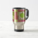 A teacher mug featuring an illustration of a green apple inside a square with green trim. Background is madras inspired plaid patchwork design. Personalise with your name.