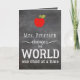Chalkboard folded thank you greeting card with red apples, teacher name and white typography script inspired from the quote "teachers change the world one child at a time". Personalise it with your teacher's name on the front and your text and signature inside and make it a thoughtful thank you gift for your best educator / mentor.