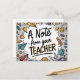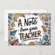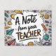 Brighten your students' day with this colourful and fun postcard! Perfect for elementary school, this 'A Note from Your Teacher' postcard is ideal for back to school greetings, or a positive note home. Teachers can use this educational and engaging design to welcome students in a memorable way. Featuring playful school supplies and an apple illustration, it’s perfect for all ages.   Add a personal message on the back to make each student feel special. Great way for teachers to develop relationships or just to share student progress.