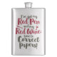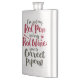 The product is a good size and came exactly as it was pictured. The lid is not attached to the flask, which could be dangerous on drunken nights... The print came out surprisingly well and looks very sharp. Would definitely recommend.
