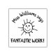 Custom teacher praise rubber stamp with cute cheerful sun illustration. The sun cartoon is bright, happy and smiling. The positive sample phrase teacher says fantastic work can be personalised with educator's name and favourite saying of encouragement.