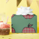 Red plaid apples decorates this wrapping paper. The design is from original art.