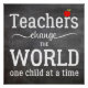 Typography script inspirational teachers quote with red apple on chalkboard background: "Teachers change the world one child at a time"