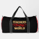 This black and red duffle bag celebrates the profound impact of educators, featuring the inspiring phrase "TEACHERS Change THE WORLD" in a bold, two-toned font with decorative accents. It's an ideal gift for dedicated teachers, mentors, and anyone passionate about making a difference through education. Edit colour of the bag caps and body in the Design tool to your favored colours.