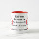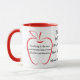 Two red outlines of apples are positioned on either side of this product. Quotes are printed in each apple. One says, "Teaching is the one profession that creates all other professions." The other apple says, "The best teachers teach from the heart, not from the book." Between these two apples are the words: This cup belongs to Mr. Andersonville, Sixth Grade Teacher, Memorial Grade School (all of this can be personalized). All words are printed in black.