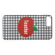 Teacher's iPhone 8 case in a black and white gingham pattern. Graphics of a plaid red apple, decorates the middle of the case, with white text reading Teacher. Personalise the text to read what you want.