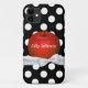 Pretty iPhone 5 case with graphics of a small flower pattern on juicy red, against a black and white polka dot background. Graphics of a white ribbon and bow runs across the bottom of the apple. Personalise the white text. Great for yourself or as a gift idea for your favourite teacher.