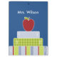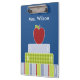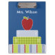 Teacher's clipboard, with colourful graphics of a stack of books and an apple, on top, against a blue background. Personalise the white text for a great teacher's gift idea.