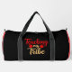 This black and red duffle bag celebrates the special bond between teachers and their students, featuring the heartwarming phrase "Teaching my Tribe" in a stylish, two-toned font with apple icons. It's an ideal gift for dedicated educators who cherish their classroom community. Edit colour of the bag caps and body in the Design tool to your favored colours.