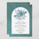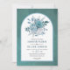 Teal and aqua blue flowers and arch summer wedding invitation. This awesome wedding design displays an arch frame on teal stained background. In the frame there is a dalia and rose flowers, foliage and pampas grass.