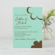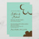 This wedding invitation features a retro, 1970s inspired theme. The background is a teal colour, with brown text and the names of the couple printed in an elegant script font. A brown, 70s style flower is printed in the bottom right, with a matching flower outline at the top.