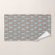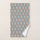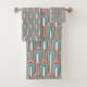 This towel set has an art deco design of arches and upside-down Ys repeating across the design in teal and copper on a field of white. Want different colours? Message me.