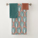 This towel set has a copper washcloth, a teal hand towel, and a bath towel with an art deco design of arches and upside-down Ys repeating across the design in teal and copper on a field of white. Want different colours? Message me.