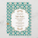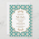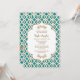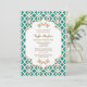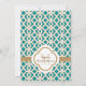 Elegant and beautiful french Moroccan inspired bridal shower invitations with a repeating teal blue green and gold geometric pattern design and gold hued floral flourishes. This upscale and luxe invite is perfect for any formal, exotic, Moroccan, Arabian Nights or Aladdin themed bridal shower. The back of these custom, fancy frame invitations and announcements can be personalised with the soon to be bride's monogram and event name on the quatrefoil shape and printed ribbon look design. Artwork and design © Chrissy H. Studios, LLC. All Rights Reserved.