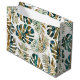 Teal and gold patterned tropical leaves brush paint strokes large gift bag. It showcases patterned tropical leaves with brush strokes in teal blue and gold and confetti. You can customise it and add your images or graphics.