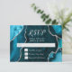 Complete your event stationery with this elegant RSVP card featuring a teal blue agate marble design accented with luxurious silver details. The bold geode-inspired background creates a dramatic and sophisticated look, perfect for weddings, birthdays, formal celebrations, or glamourous evening events. Designed with clear response sections, this RSVP card allows guests to easily confirm attendance, indicate number attending, and respond with acceptance or regrets. The clean, modern typography keeps details easy to read while complementing the rich agate texture. Easily personalise all text to suit your event and coordinate beautifully with matching stationery.