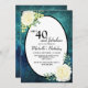 Teal and white grunge watercolor 40th birthday party invitation / "40 and fabulous" with white roses and grapes.