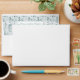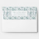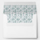 This envelope has a white exterior with a teal and white watercolor damask design on the inside and outside flap. The return address is on the outside flap in a teal all-caps serif font with a thin teal border surrounding the address. Behind the address is a coordinating damask design. This envelope coordinates with the other products in the Elegant Rose Crest Monogram Wedding Collection.