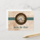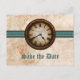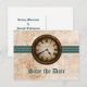This Antique Clock Save the Date Postcard features a vintage timepiece prominently centred on top of a metal ball chain and sleek teal striped border. The distressed look of the grungy paper texture background completes the antiqued feel of this unique design. This offbeat save the date postcard is perfect for announcing your vintage or steampunk inspired wedding. Easy to customise, simply add your wedding details in the spaces provided. Click on "Customise It" to find additional options to personalise this design.