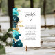This elegant modern wedding table number card features a border of teal blue and aqua flowers and gold faux foil leaves. The word "table" appears in charcoal gray handwriting script on a white background. Add the names of your guests who are assigned to each table.