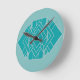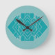 This clock, has an art deco quilt-inspired design of diamond shapes and a rectangle, both in teal and silver, on a field of lighter teal.