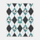 This cool soccer team colours fleece blanket features a teal blue, black and white argyle plaid pattern with teal "stitching" extending diagonally across the diamond shapes and black and white soccer balls overlying the teal diamond shapes - customise with athlete's monogram - by katz_d_zynes