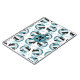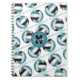 This cute volleyball themed notebook features a mirrored pattern of teal, black and white volleyballs with the phrase "The volleyball court is my happy place" in a casual handwritten-style font along with heart shapes in teal stretching between the angled rows of volleyballs - athlete name and monogram can be personalised on the overlying circle pendant - background is customisable white - easily replace the monogram with the player's varsity letter or jersey number - by katz_d_zynes