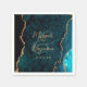 These elegant modern wedding napkins feature a teal blue watercolor agate geode background trimmed with faux gold glitter. Personalise them with the names of the couple in gold-coloured handwriting calligraphy over a large teal ampersand, and the wedding date in copperplate font.