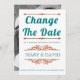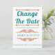 Vintage elements and teal blue and rust typography wedding Change the Date postponement announcement. This elegant wedding design displays the text "Change the Date" in bold teal blue typography and vintage elements that form frames for the text. The back features the photo of the couple.
