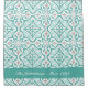 Elegant Spanish style shower curtain with a stylish teal blue and white mexican tile print. There's a blue stripe across the bottom for you to add your family name and message