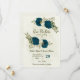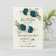 Beautiful romantic wedding save the date invitation featuring teal blue and beige flowers and some leaves .