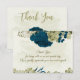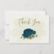 Beautiful romantic wedding thank you card featuring teal blue and beige flowers and some leaves .