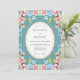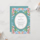 This watercolor design features a vibrant teal blue background adorned with a symmetrical border of pink cherry blossoms and light blue hydrangeas. Soft green foliage provides a natural touch to the artistic floral arrangement. The overall aesthetic is cheerful and romantic, perfect for a spring or summer seasonal event. The palette balances bold jewel tones with delicate pastel accents.