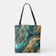 Elevate your daily carry with this stunning, personalized tote featuring a luxurious abstract design. The artwork mimics the organic beauty of alcohol ink fluid art, swirling with rich shades of deep teal, turquoise, and aqua blue, accented by elegant veins of faux gold foil and glittering textures.