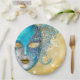 Teal blue and gold masquerade party paper plates with beautiful teal blue mask on a gold bokeh glitter background. You can add text to personalise. Printed design with no real glitter.