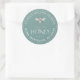 Personalise with your apiary name and address, honey net weight and any honey descriptors (pure, raw, clover, etc.). Vintage bee design in centre. White text and illustration on a blue-green background. Common honey net weight conversions: 8oz (227g), 12oz (340g), 16oz (454g), 32oz (907g), 5lb (2.27kg).