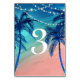 Are your tropical wedding theme colours teal blue and peach? Here are some unique, tropical table number cards that will complement your ocean beach destination wedding beautifully! This elegant watercolor design illustrates blue palm tree silhouettes along with romantic strings of lights. Category: tropical wedding table numbers; palm tree table number card template; beach theme wedding ideas. Colours: teal blue, peach, pink, aqua and sea green.