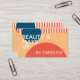 Beautiful artistic makeup artist business card. With contemporary teal blue, rust, orange and ivory off-white coloured round circles and stripes pattern on a blush pink background combined with a modern minimalist font. Click on 'Personalise' to find the template ready to be customised with your unique business name, profession and contact information, and text of your choice. This particular pretty and unique design was made for those who like bright colourful pastels and sophisticated classic geometric abstract designs.