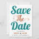 Teal blue and rust typography and photo on the back Save the Date announcement.