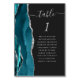 The left-hand edge of this elegant modern wedding table number card features a teal blue watercolor agate border trimmed with faux silver glitter. The word "table" appears in silver grey handwriting script on an off-black background. Add the names of your guests who are assigned to each table.