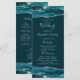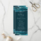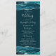 This elegant, modern wedding program features teal blue watercolor agate top and bottom borders trimmed with silver faux glitter. The text appears in elegant silver grey handwriting and copperplate fonts on a deep teal background.