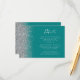 The left-hand edge of this elegant modern wedding details enclosure card features a silver faux glitter design. The customisable text combines pale silver grey handwriting, copperplate and italic fonts on a teal blue background. The reverse side features a matching teal and silver glitter design.