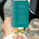 This elegant, modern wedding program fan features a teal blue background edged with silver faux glitter. The text appears in elegant silver grey handwriting and copperplate fonts.