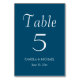 Guide your wedding reception guests to their table with this simple style table number card that features white, stylised lettering on a trendy, teal blue colour background. Design is on each side of card. Edit your card to change table number, wedding couple's names and date. Order cards separately for each table number.