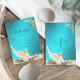 Beautiful seashells on white beach sand stand out against the turquoise teal blue aqua background, on this modern elegant beach themed wedding RSVP card.